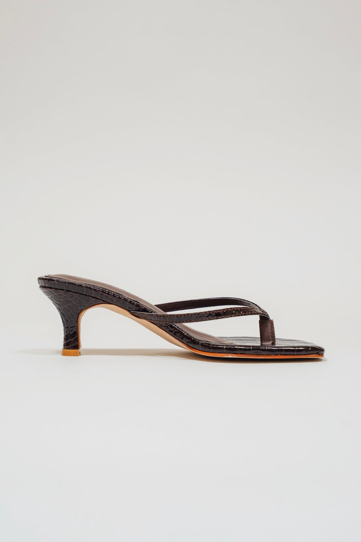 Introducing Natalie, the newest addition to our Out of Office Collection. This chic slip-on thong sandal reimagines a classic silhouette with a bold twist. Crafted from sophisticated croc leather, it effortlessly elevates any outfit. Ideal for both work and play, this kitten heel is a must-have in your shoe collection.